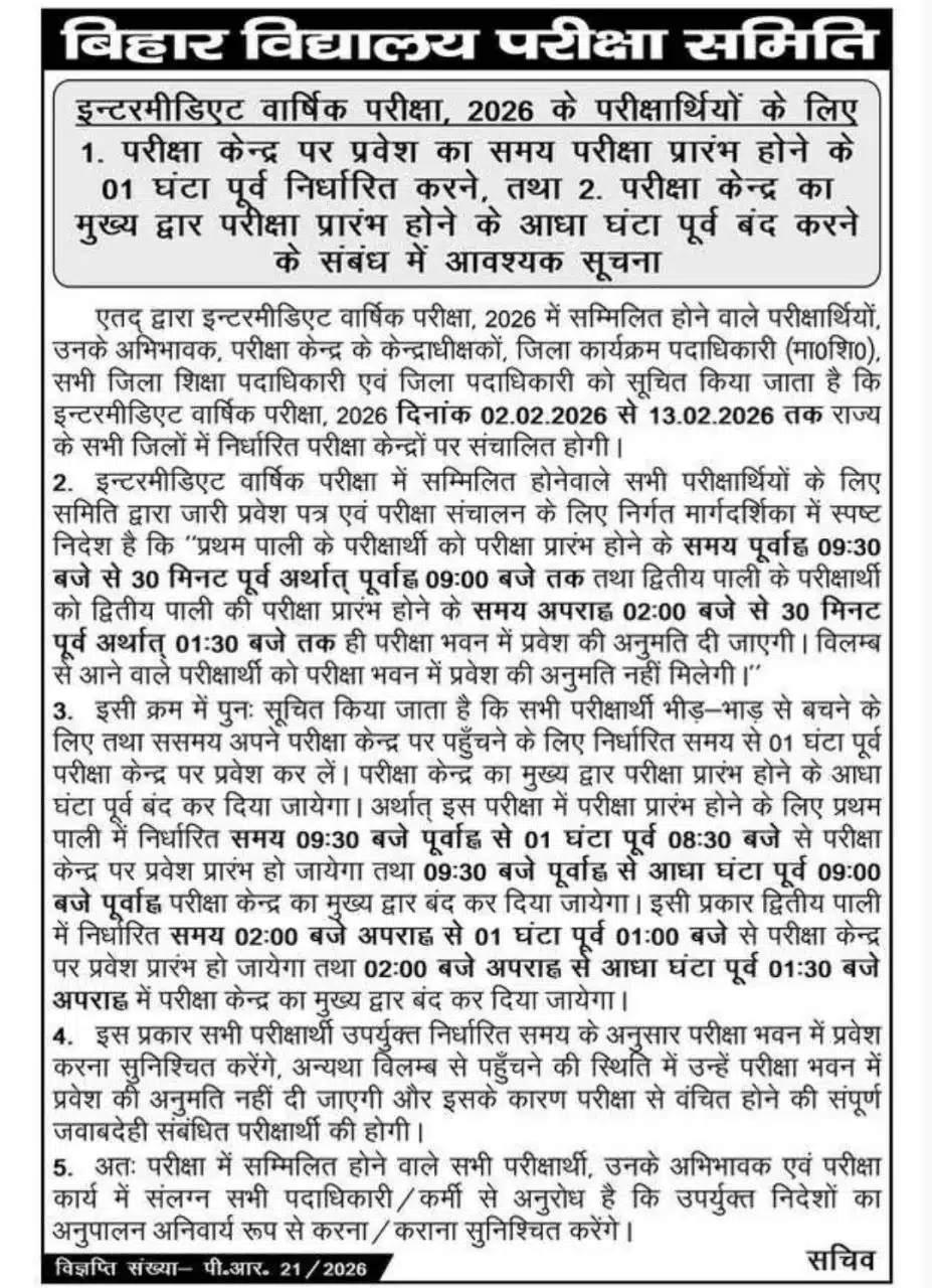 Bihar Board Inter Exam 2026 -Entry Guidelines परीक्षा केंद्र का मुख्य द्वार आधे घंटे पहले बंद हो जाएगा