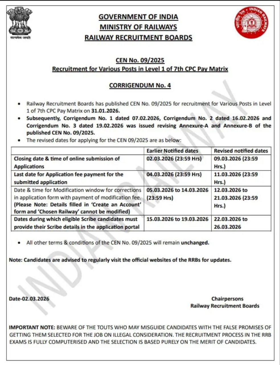 ONLINE applications are invited by RRBs from eligible Indian Nationals and other nationals as brought out in 09 of CEN for Recruitment for Various Posts in Level 1 of 7th CPC Pay Matrix. Applications complete in all respects should be submitted ONLINE to the Railway Recruitment Board of choice by 23.59 hrs. of 02 March 2026. All eligible/interested candidates can apply online at the important link section below.